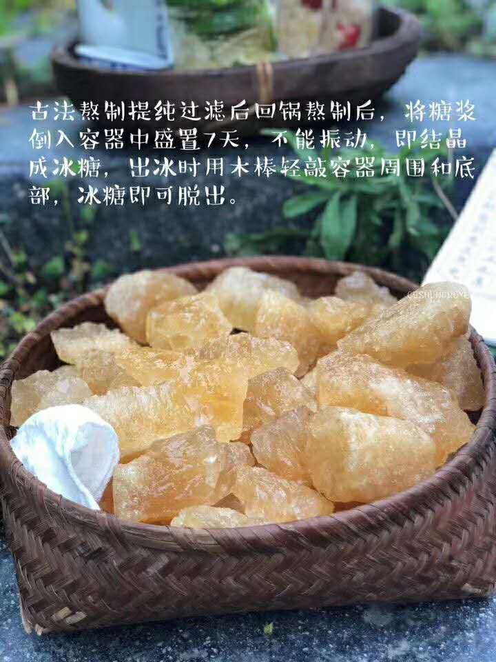 我们的老冰糖的原料采用青皮甘蔗,以传统制糖工艺制作,无任何添加,无化学品漂白。做出的冰糖口感清香,甜度适中。