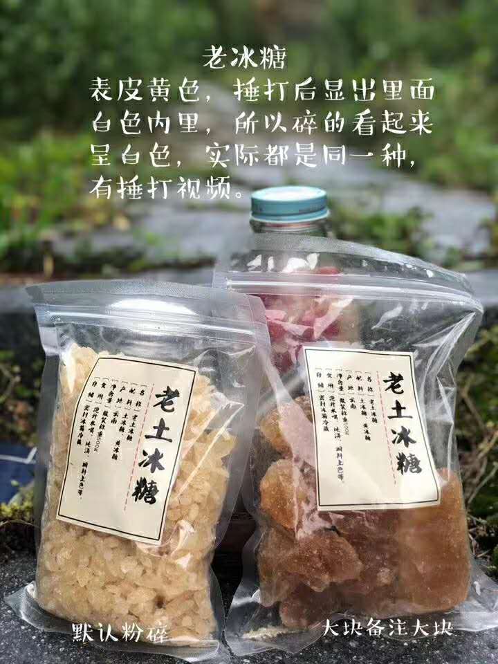 脱出后大块冰糖表面呈现黄色,内里为白色,手工捶打成小碎块,所以碎的小块是白色,大块黄色,都是同一种。
