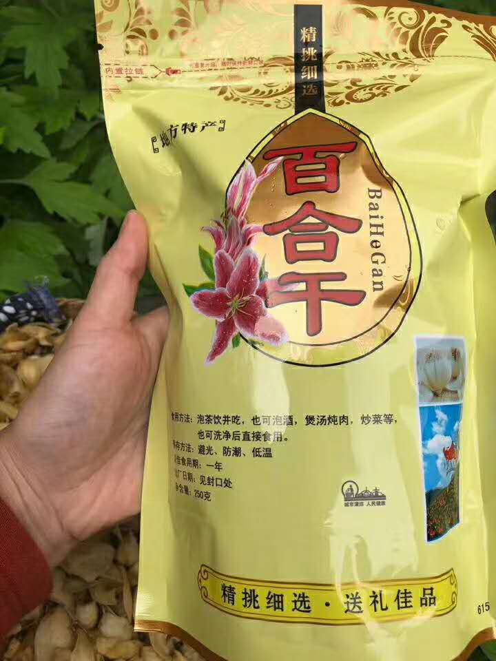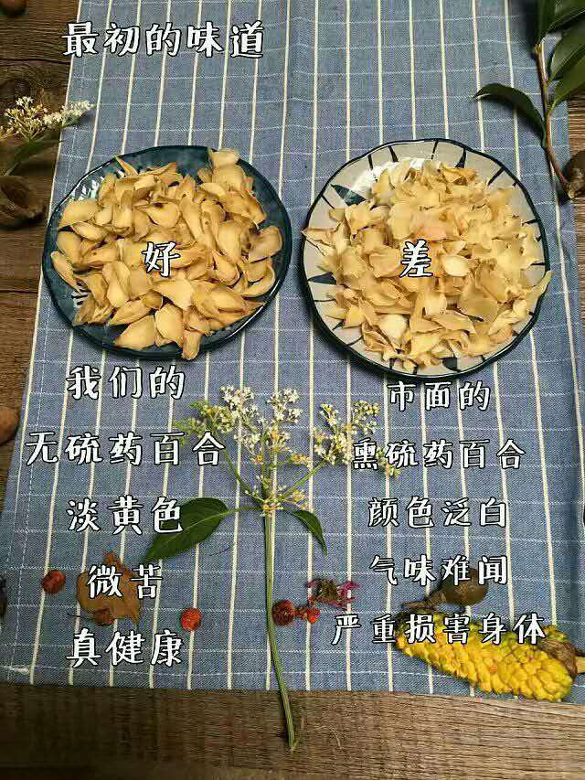 咱们的药百合纯天然,不用硫熏,所以颜色偏黄,有中草药味儿。