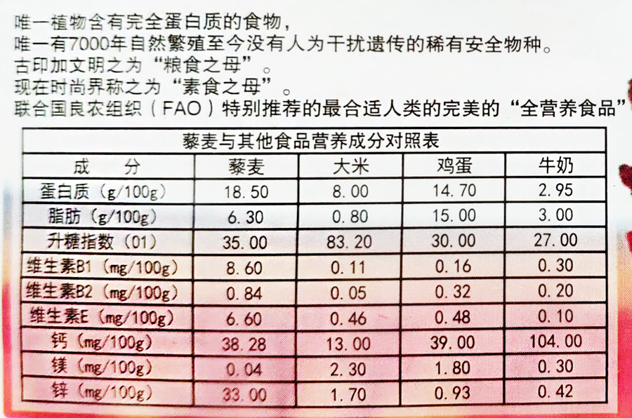 被誉为“如果人类去火星只能带一种食物一定是——藜麦”、“唯一一种FAO确认的满足人体基本营养需求的单体植物”、“全营养食品”、“超级谷物”。