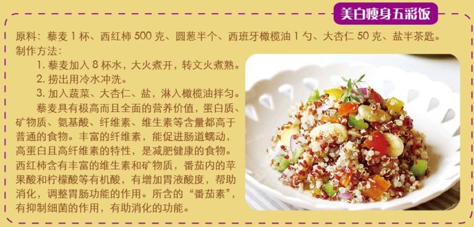另外,藜麦营养全面,作为植物拥有全部9种人体必需氨基酸,且蛋白质含量足以与牛肉相媲美。吃藜麦减肥不会造成营养不良、头晕、无力等症状。