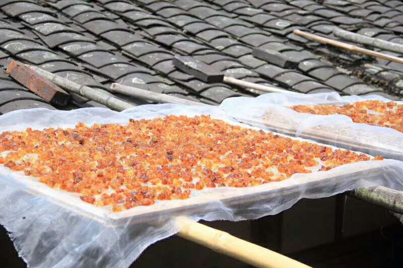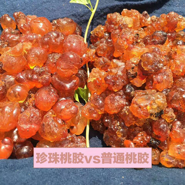 采摘之前它们是一样的,我们采摘晒干后从桃胶堆中挑选出最精致漂亮的桃胶,也可以俗称选美,100斤只能选出1斤多点,挑出来的就成了珍珠桃胶,剩下的就是性价比高的普通桃胶。