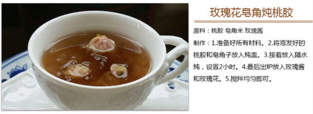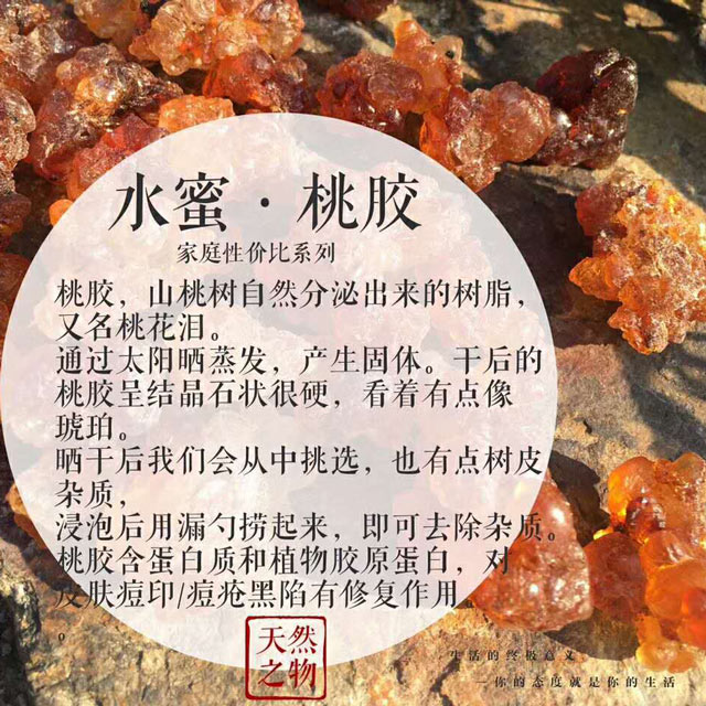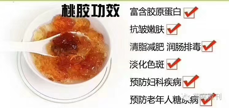 桃胶在古代是一味中药,用于治疗血淋,痢疾。如今桃胶因具有保养颜功效,与燕窝类似,为嫩肤养颜保健之佳品。