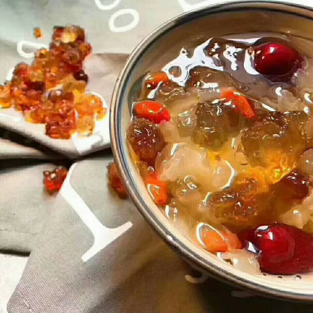 干的桃胶呈结晶石状很硬,看着有点像琥珀。吃之前需要用水泡发8小时以上,泡发后的桃胶可涨大很多倍,所以一次的用量不多,大概10-20克。买一斤,能吃很久呢。