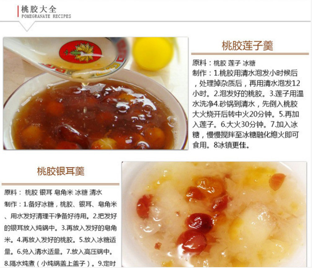 据传,桃胶也曾是当年慈禧太后钦点御用的养颜补品,桃胶与皂角米、银耳搭配烹煮成汤长期食用具有有清血降脂,缓解压力和抗皱嫩肤的功效。