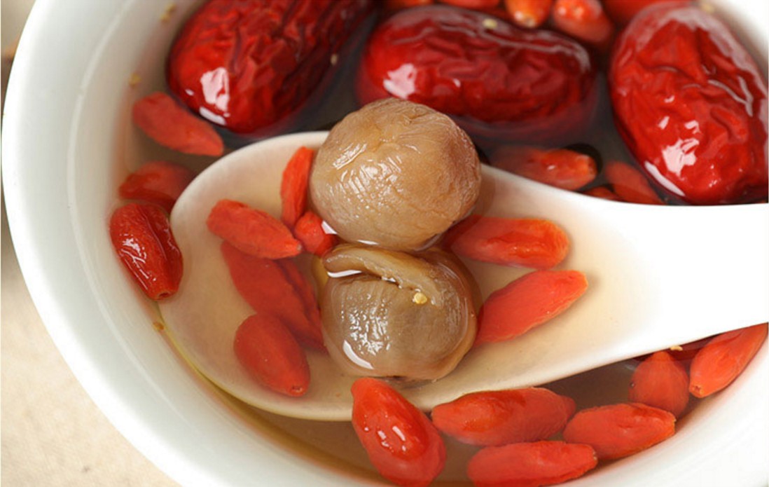 原料:红枣60克、桂圆30克、枸杞子30克、红糖30克、水800克
