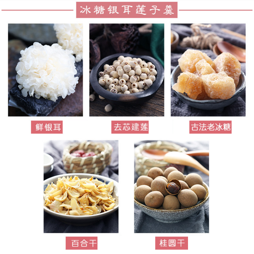 要做桂圆红枣枸杞红糖水,冰糖银耳莲子百合羹,原料我们都有售哦,点击图片购买: