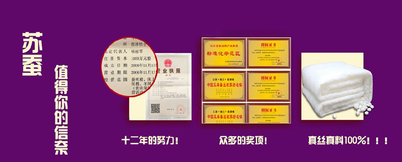“苏蚕”牌蚕丝被是由苏州多利伦蚕丝有限公司生产的采用传统工艺手工制作的纯天然优质产品。公司坐落于吴江震泽镇,这里以盛产蚕丝和丝绸闻名,被中国纺织品商业协会授予“中国蚕丝被之乡”的称号。公司将传统工艺和现代化管理模式相结合,通过了ISO9001质量管理体系认证,从原料到成品层层把关,以制造“贡品”的态度来生产蚕丝被,用国家最高级别的桑蚕丝执行标准,将“苏蚕”品牌打造为江苏著名商标,获得消费者喜爱和信任,12年来从无投诉。