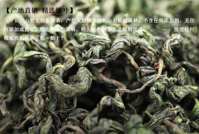 我们的刺五加茶来自长白山原始林区,野生野长,无污染。春天将采集来的刺五加的嫩叶,按烘制绿茶的方法(杀青、揉捻、干燥),制成的刺五加茶。