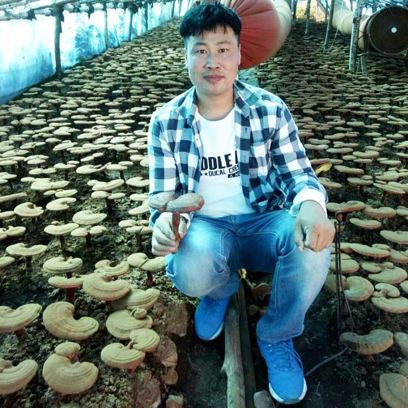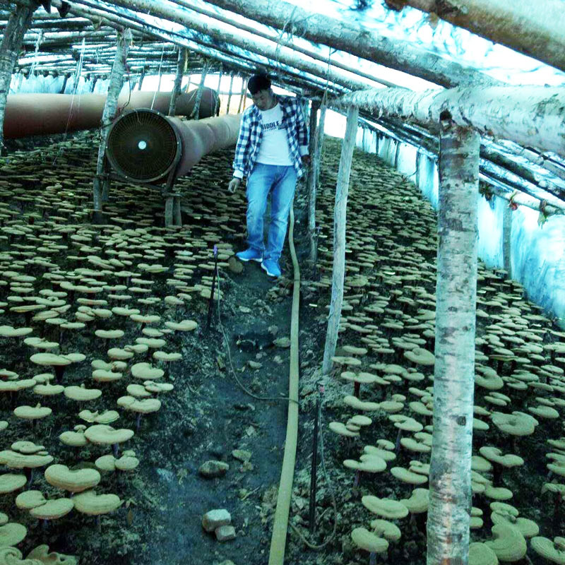 将椴木段蒸三天灭菌,把发酵好的菌种种到椴木上。天气转暖后将菌椴移栽到大棚里,上面铺上一层沙子,保持温度湿度,等灵芝发芽,长大,喷粉,收集。