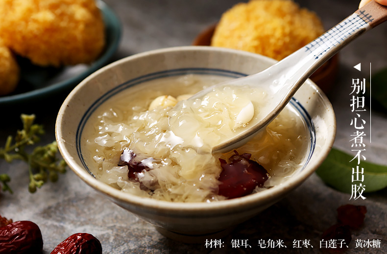 3. 银耳富有天然植物性胶质,加上它的滋阴作用,长期服用可以润肤,并有祛除脸部黄褐斑、雀斑的功效;