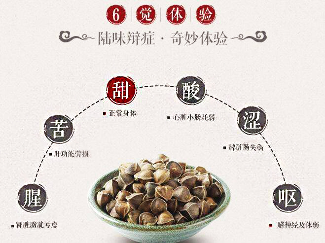 健康人吃辣木籽会觉得先苦后甜,如果不是,通过辣木籽吃出的味道可以判断出你身体的症状,即“入口六味辨症”: