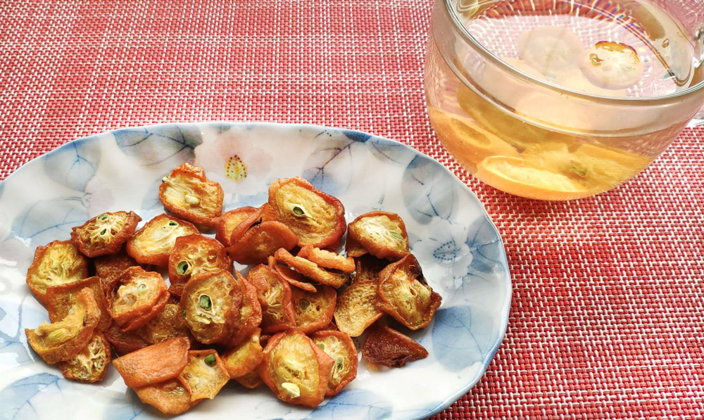我们的金桔干产自浙江缙云,这里山清水秀,无工业污染。山上种植的金桔,不打农药,采摘下来切片后,不加糖直接烘干,果干自然香甜,泡茶喝生津止渴、化痰利咽,让爱吃金桔的人一年四季都能回味。