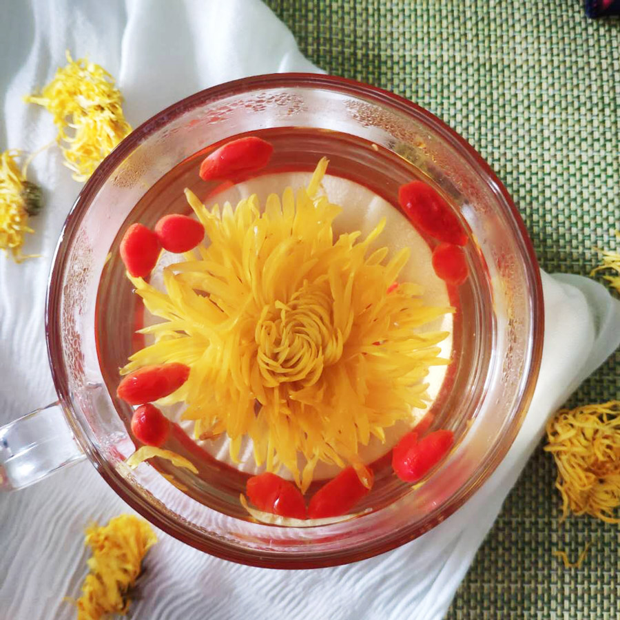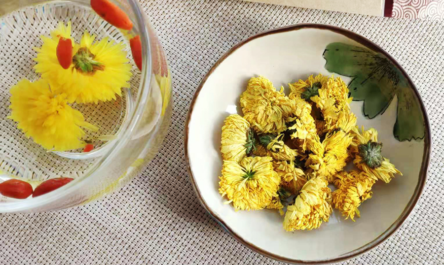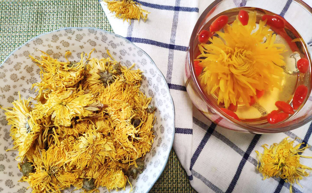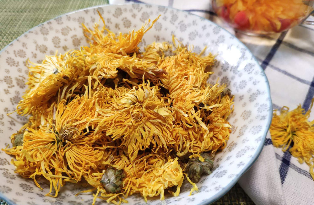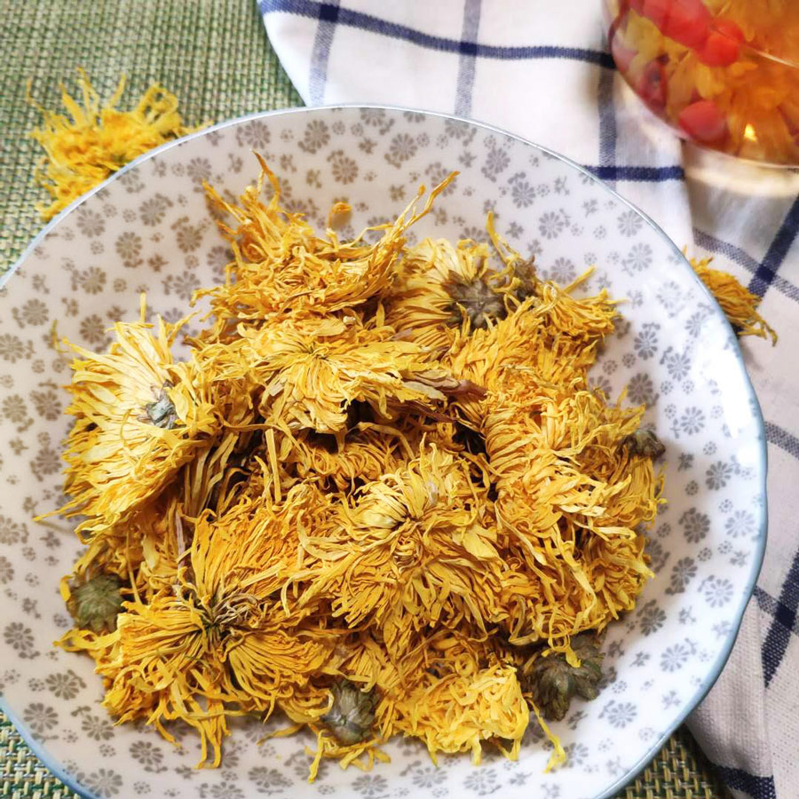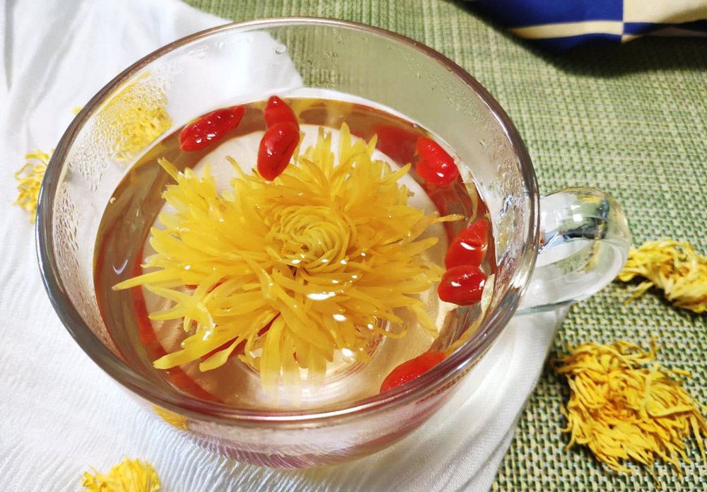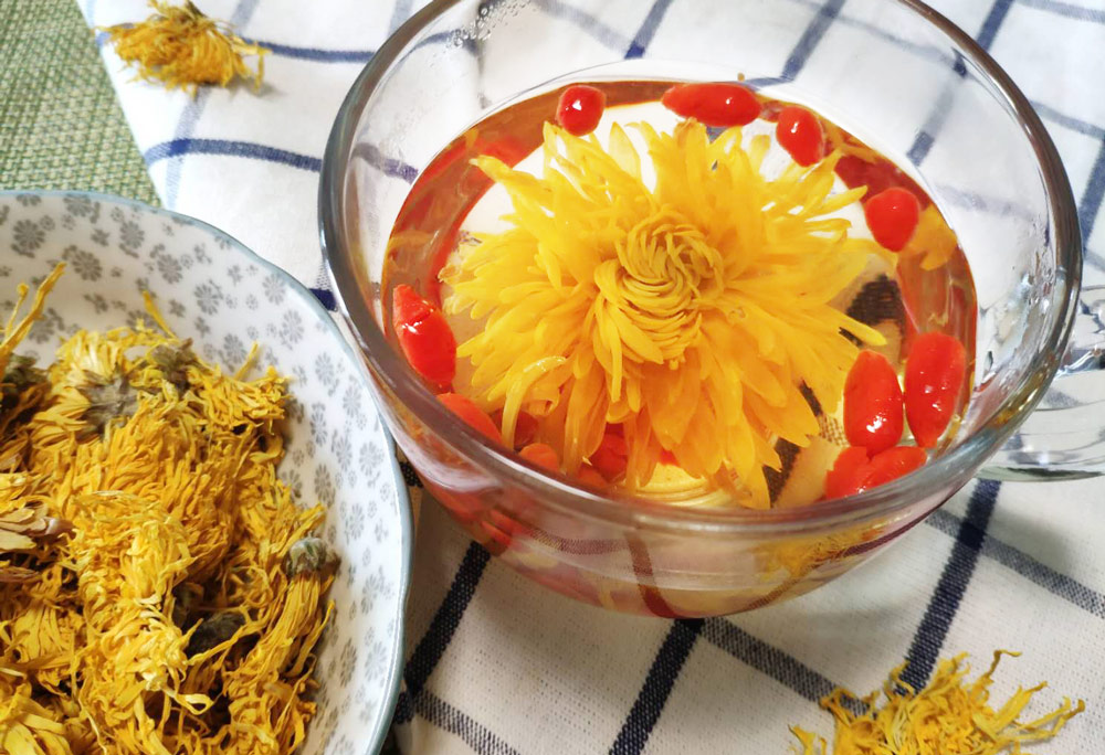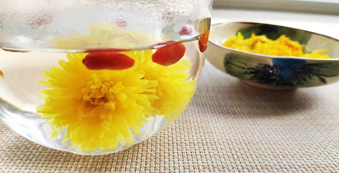 菊花性凉,平时怕冷、虚寒体质的人可搭配温性的食物一起饮用,比如枸杞、金桔干等。