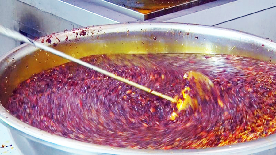 在油辣椒的炒制工艺中,食材和调味品有着严苛的顺序和定量。整整一个小时不停翻炒,调料和辣椒的香味最终才能实现完美的融合。还要根据每一个品种独特性来调配口味。