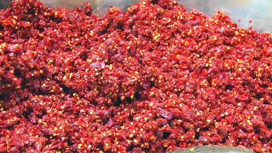 制作油辣椒需要把辣椒经过筛选、淘洗、粉碎后,在大炒锅里放入上好的菜油,油温到180℃左右,依次放入姜、蒜、芝麻爆香,再将一大盆粉碎好的辣椒倒入炒锅翻炒。