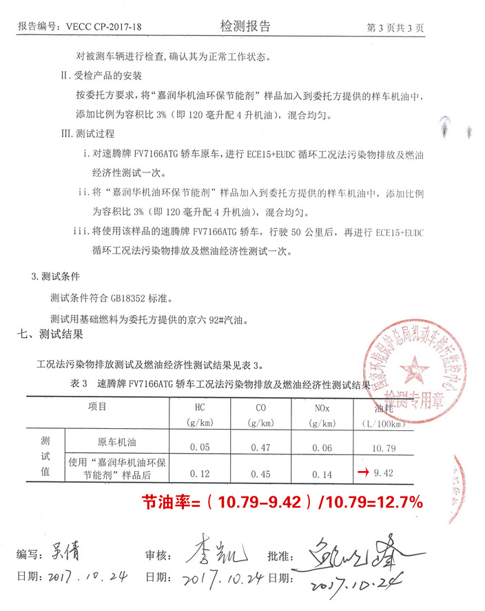 2017年10月经环保部机动车排污监控中心采用工况法检测,汽油车节油高达12.7%!
