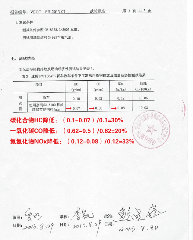 2013年9月经国家环保总局机动车排污监控中心采用工况法检测,有效降低碳化合物HC30%,氮氧化物NOX33%,一氧化碳CO20%,明显减少PM2.5对环境的危害: