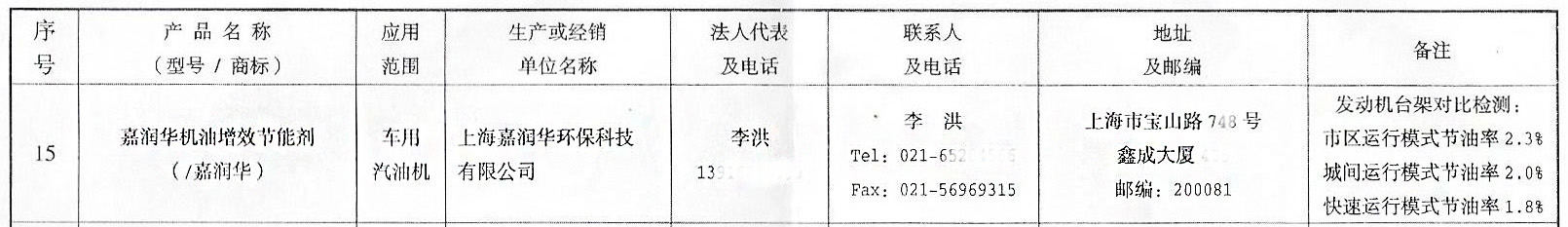 经交通运输部主持严格检测,并组织专家评审,我公司生产的嘉润华环保节能剂获得“十一五”营运车船全国重点推广节能产品证书。通过一汽奥迪、江铃汽车、海马汽车、吉利华普汽车、力帆汽车等汽车生产企业的检测验证。