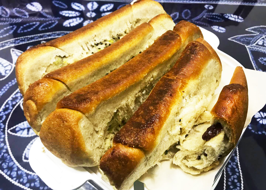 2、揉面,分成五份面团,擀成牛舌状,加入芝士,内卷成条筒;