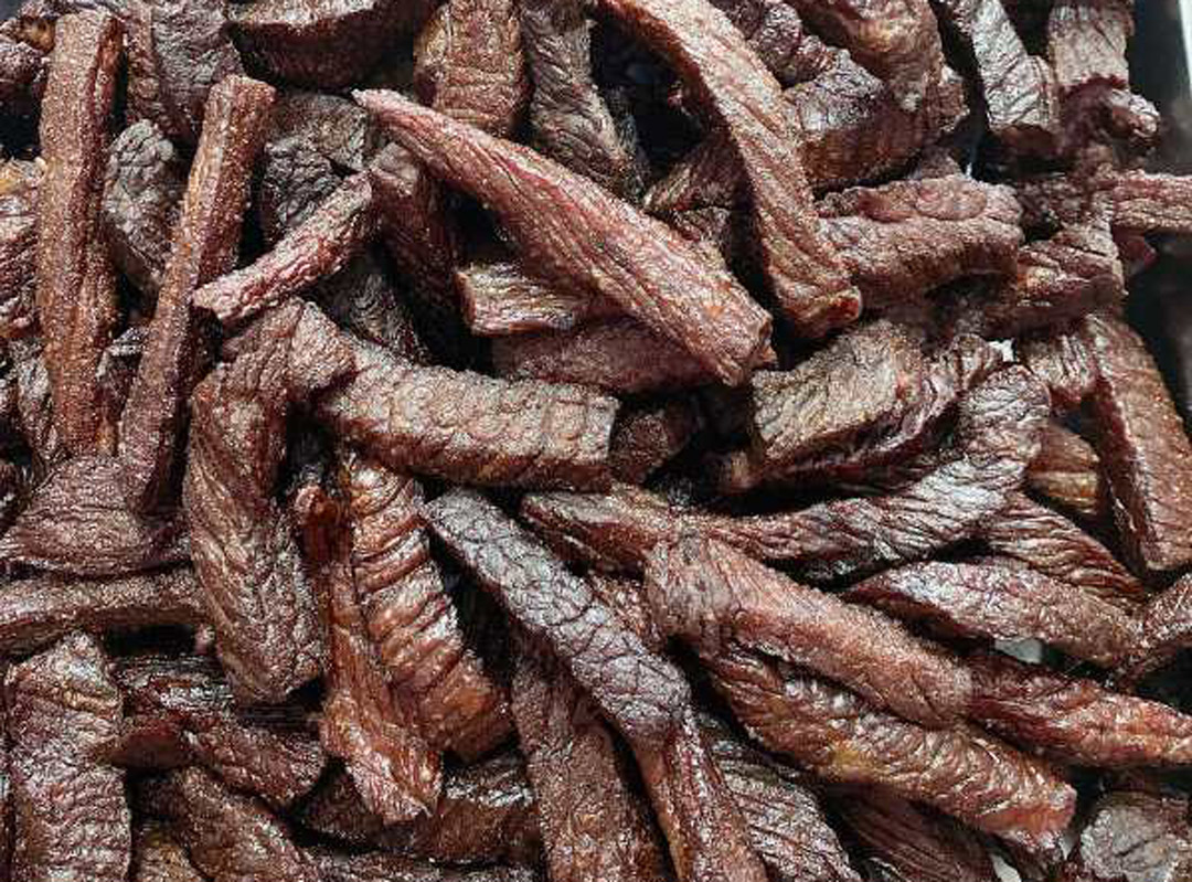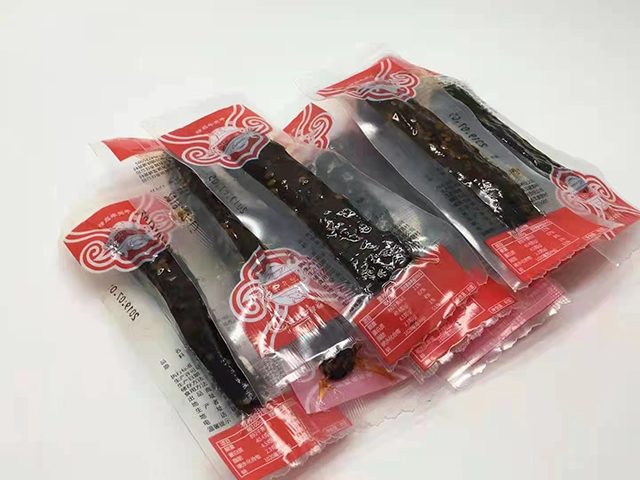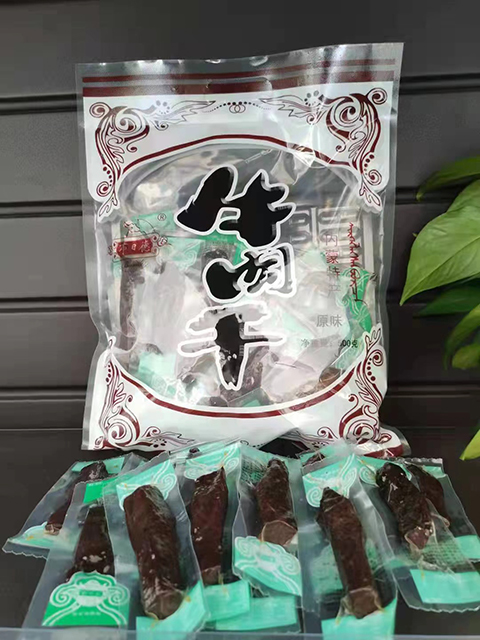 先将生牛肉切成条,用盐、料酒、少量调料腌制几个小时,然后悬挂起来风干,再用炭火烤到7、8分干,就装袋,抽真空。香辣味和孜然味是碳烤后放的佐料。