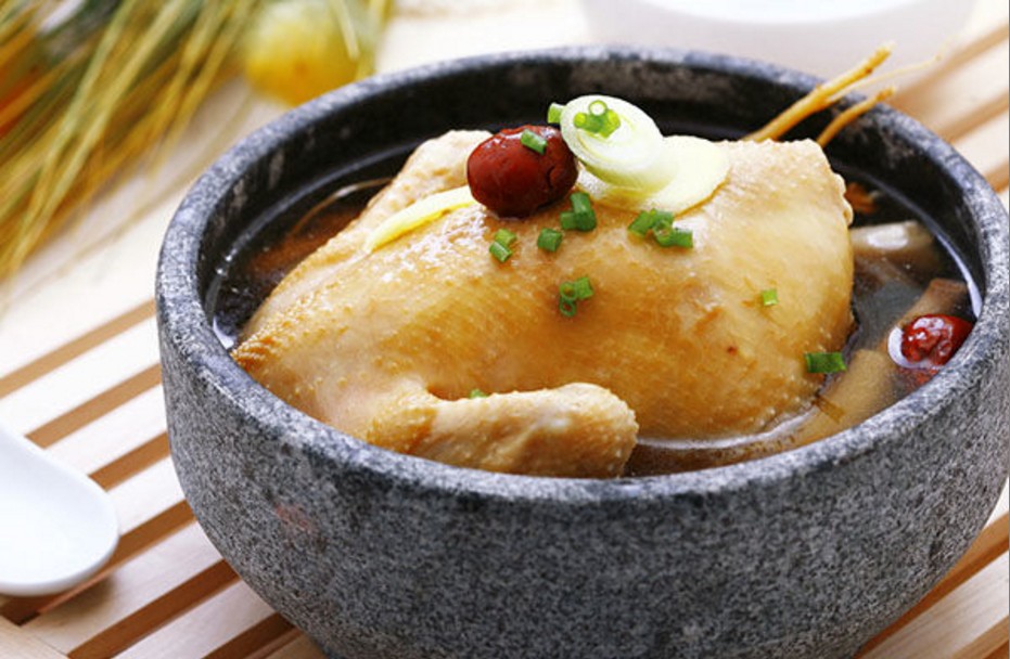 材料:土鸡1只、蜜枣、党参各10克、调味料:葱姜若干、黄酒、盐、油适量