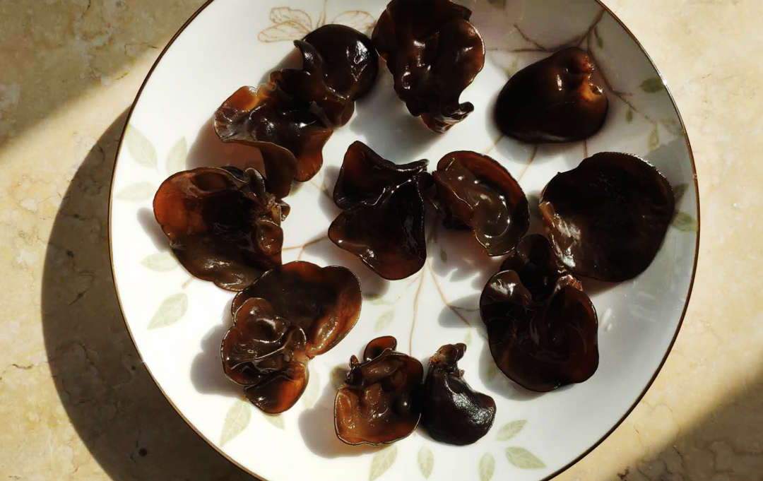 呈深黑色,有光泽,耳背呈暗灰色,无光泽,朵片完整,无结块,易捏碎,无韧性,用舌轻舔无味。