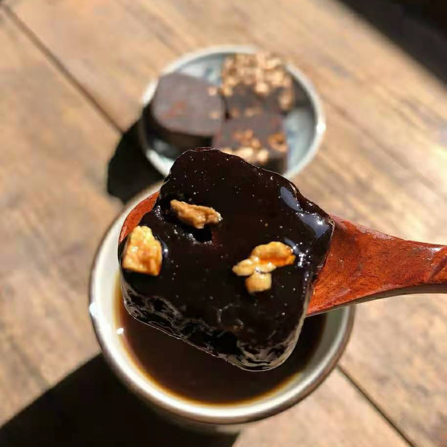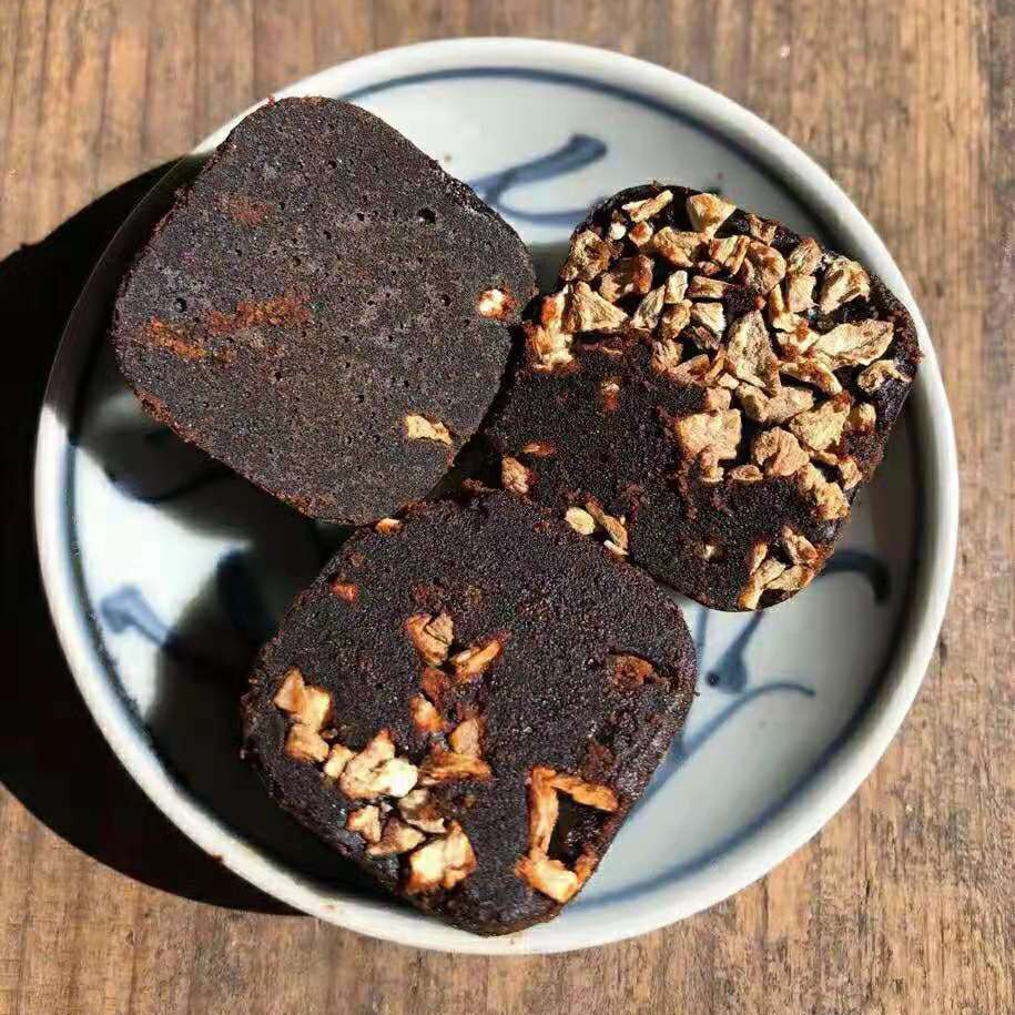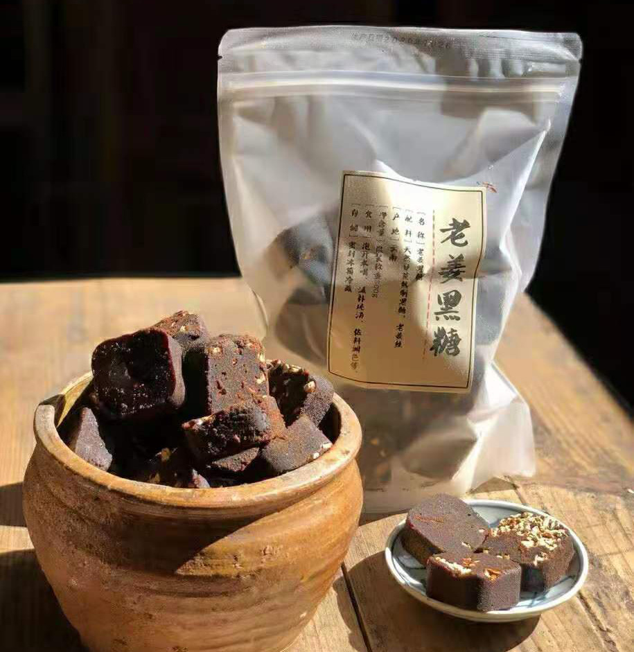 黑糖,是用甘蔗榨汁后慢慢熬制而成,跟红糖制作过程类似,但熬制的时间比红糖更长,颜色更深,带点焦香。在最后阶段加入老姜。