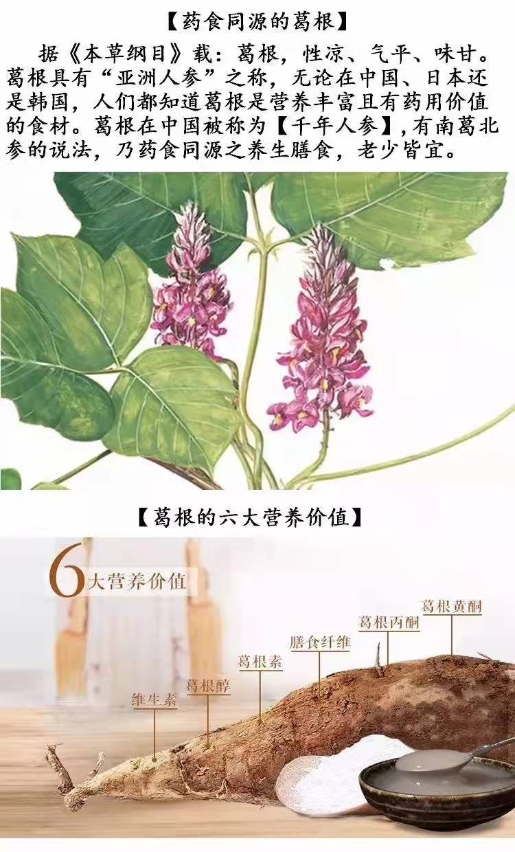 作为药食两用的中药材,在我国传统医学中,葛根味甘、辛,性平,无毒,归胃、脾、肺、膀胱经,主要有解肌退热;发表透疹;生津止渴;升阳止泻的功效。葛根粉,其主要成分是淀粉,因此冲水时,可以冲成半透明的糊状,这是其中淀粉的作用,除了淀粉之外,葛根粉中还含有葛根素,大豆苷元,多种不饱和酸,多种植物甾醇以及多种微量元素。