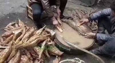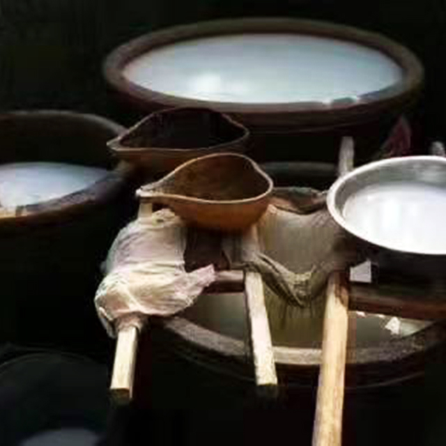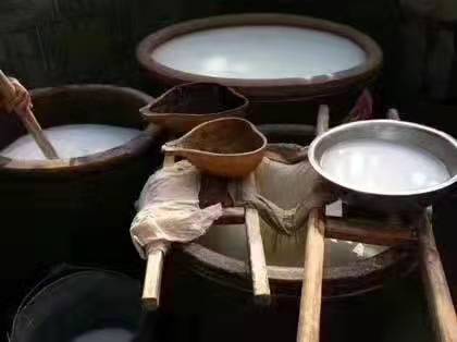 只有山里的野生葛根才能磨出黄褐色的葛根汁,然后沉淀,用纱布过滤掉粗纤维和杂质,留下乳白色的葛根浆,再用细棉布过滤掉水分。