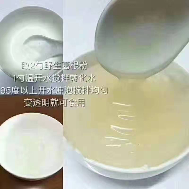 葛根粉的冲调也有讲究,每日服用量10克-20克即可,将葛根粉放入碗中,先缓缓加入温水,至没过葛根粉即可,搅拌使其溶胀基本均匀,然后再加入煮沸的开水(95℃以上),进行冲调,这样冲得的葛根粉,均匀清亮,呈晶莹透亮的糊状,口感也最好。