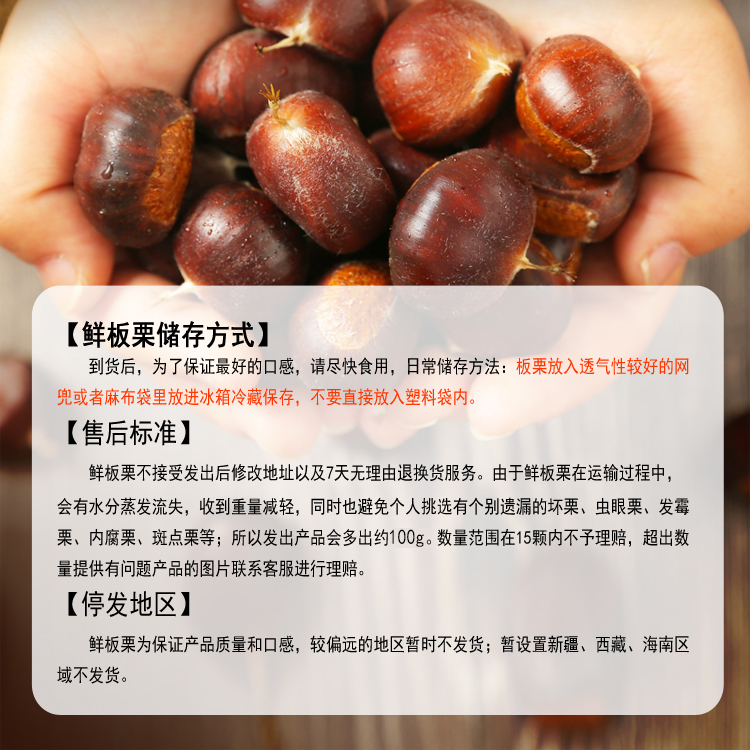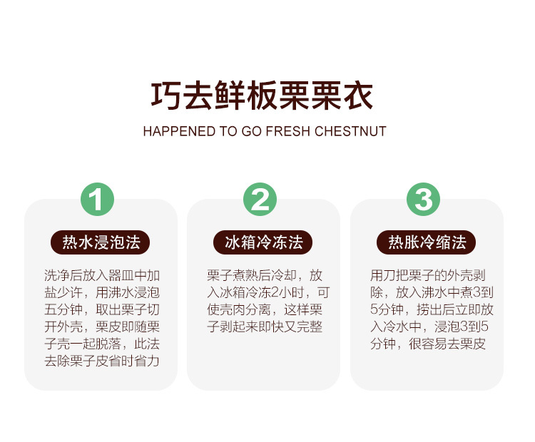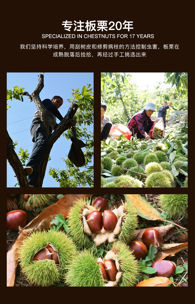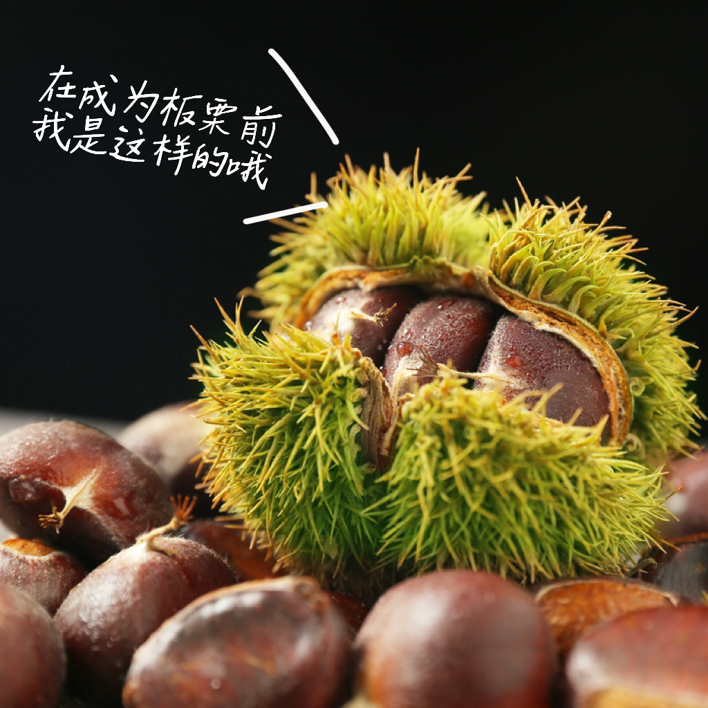 真正的鲜板栗,无任何添加,自然生长,闻着会有股浓郁的板栗香甜的味道,人工除去带刺的栗篷,剔除品质不好的板栗,为您精挑细选每一颗板栗。