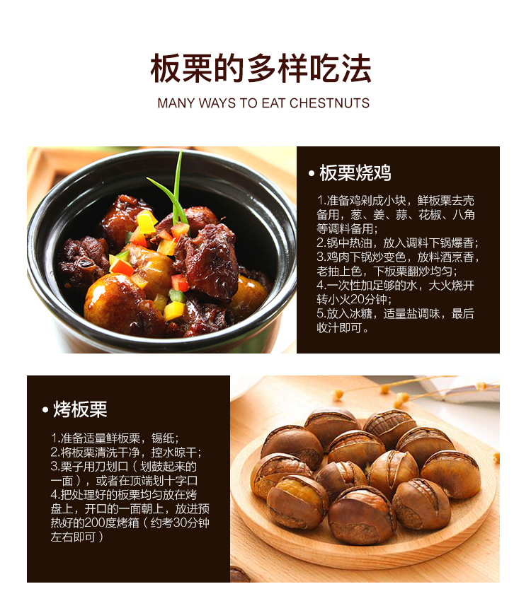 板栗营养丰富,不仅生吃脆甜,还特别适合糖炒、烘培、还可调羹烹菜……,生吃脆甜可口,蒸煮软糯香甜,炖肉炖汤样样营养百搭。