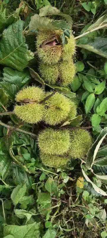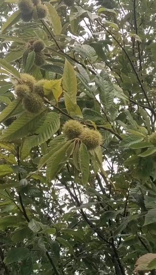 2、这片板栗林是野生的,不是人工种植,也不是那种锥形野板栗,而以此认为这个不是野板栗,特此说明:每个地区的野板栗品种类型的实际分布是有一定的差别,成熟时间根据海拔不同会有差异。尤其这一片当时在生产队时期有过拓荒改造,改造就是增加新品种和就地野板栗做嫁接,有些树太大了,只做部分枝条嫁,嫁接后有活的也有没活的,一直野放至今,不过可以肯定不是现代的新嫁接品种,所以板栗颗粒依然很小,现在嫁接的都是大板栗,