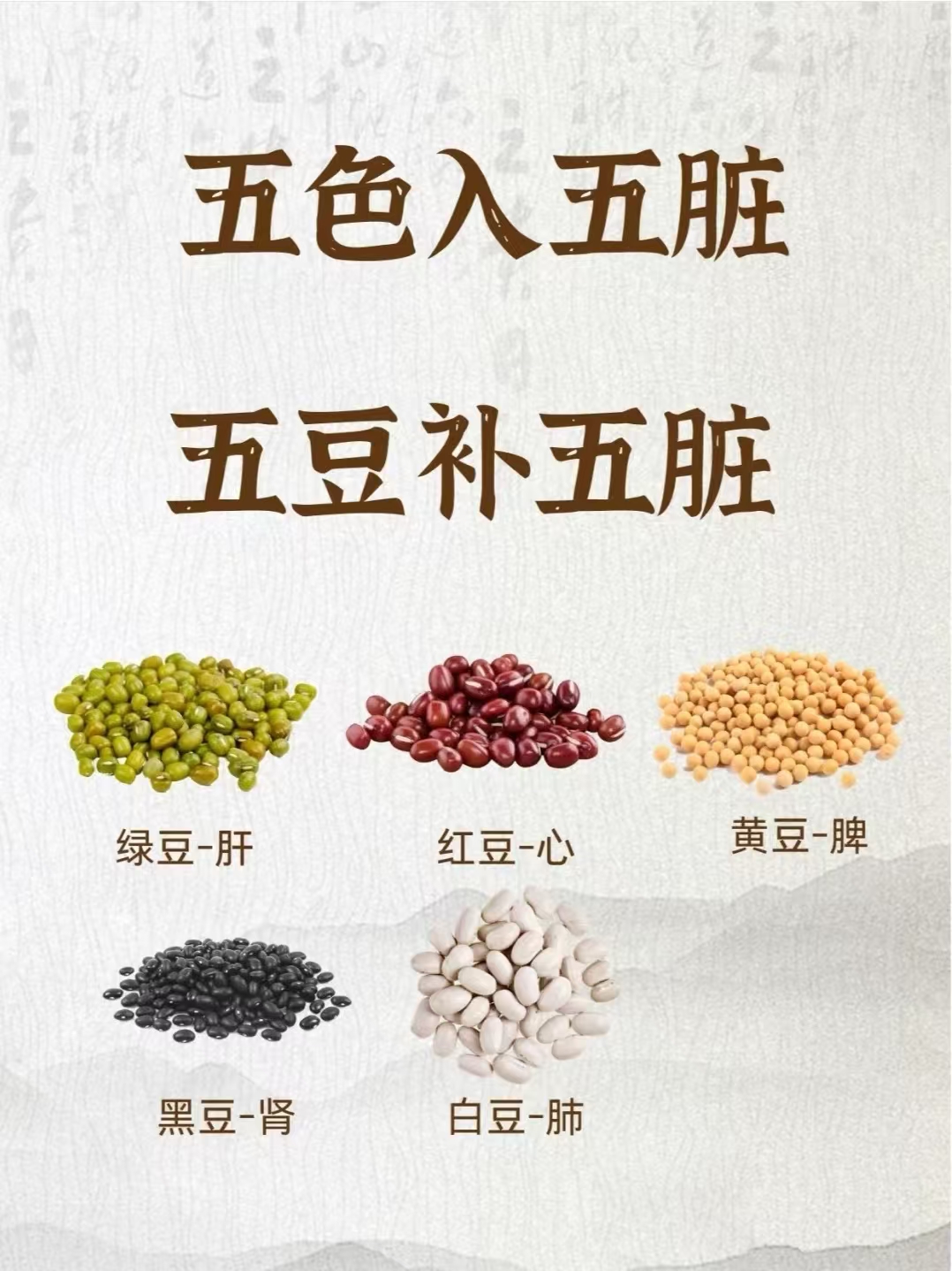 A、红豆:补心补血;绿豆补肝、清热解毒,降低胆固醇;黄豆补脾补气,常食有助于延缓衰老;黑豆补肾;白豆补肺,理中益气。在豆糊制作中,这五色豆也是常用原料。其实,在制作豆糊时,可以再加些各色米粉和芝麻、花生等果仁粉,营养会更全面。