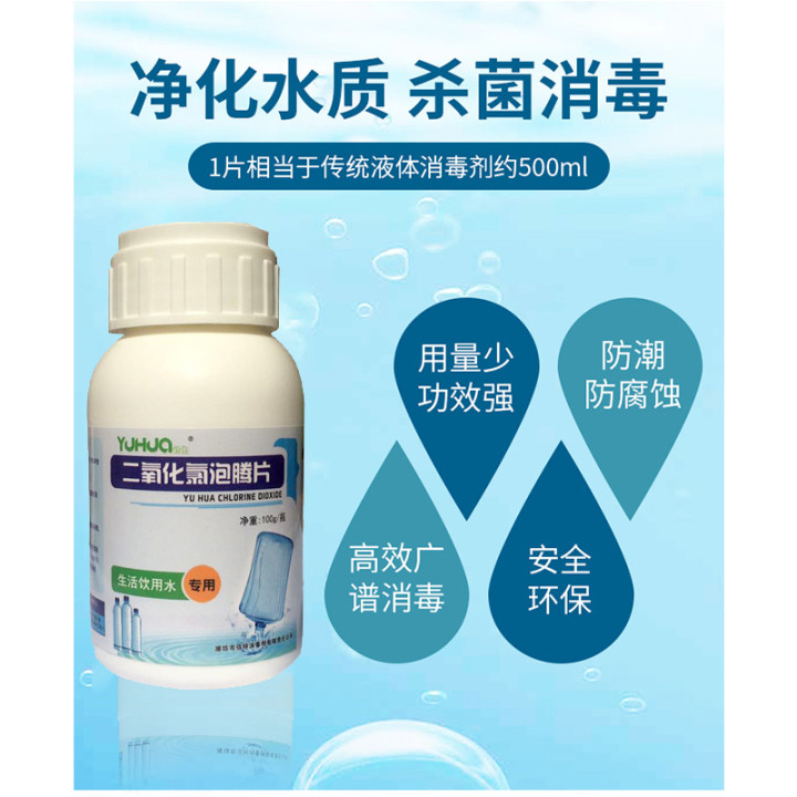 每片约一克,一片可消毒井水或山泉水自来水等水源160-400KG(0.2-0.5mg二氧化氯/升水)。可以根据水源情况酌量而定,可直接投加,或按本用量比例范围推算实际水池容量计算配比后,将片剂倒入一个盆里泡腾成母液后泼入池中静置30分钟后即可,也可用泵加入水系统。