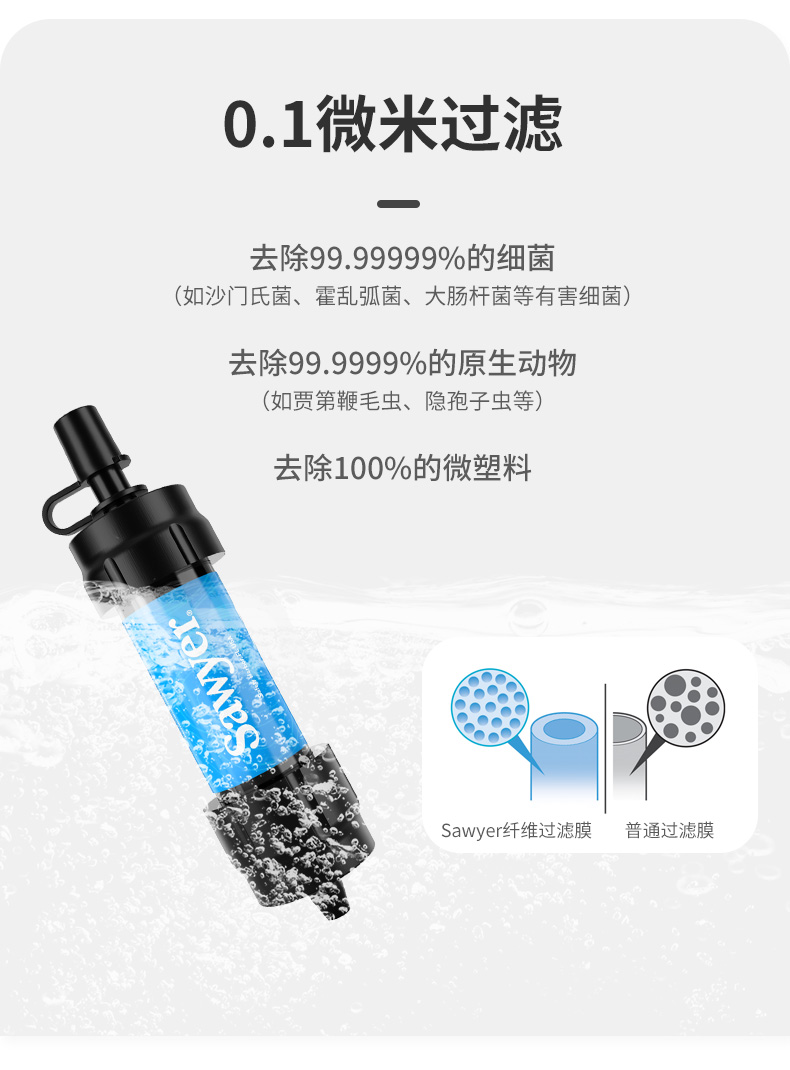 Sawyer净水器采用 0.1微米中空纤维膜,可过滤 99.99999%的细菌(如大肠杆菌、沙门氏菌)和原生动物(如隐孢子虫、鞭毛虫),远超美国环保署(EPA)标准。但需注意,其无法过滤病毒,若水源存在病毒风险,建议烧开后饮用。